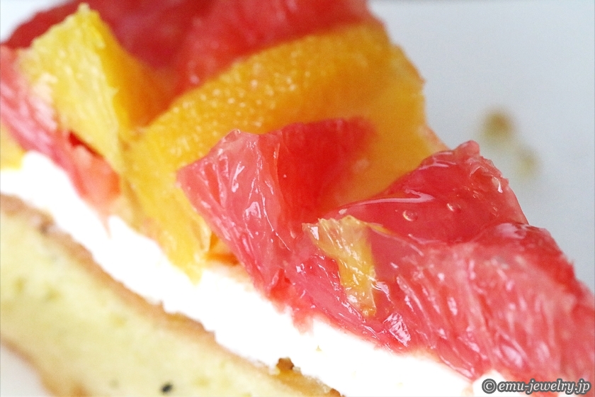「オレンジの香りをつけた紅茶の茶葉を練り込み焼き上げた生地に濃厚なマスカルポーネクリーム。爽やかな酸味と甘味のルビーグレープフルーツ。」